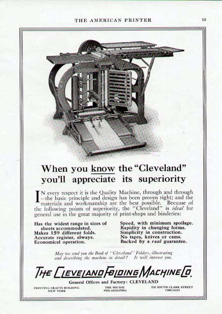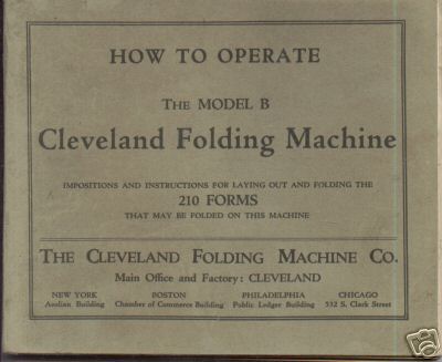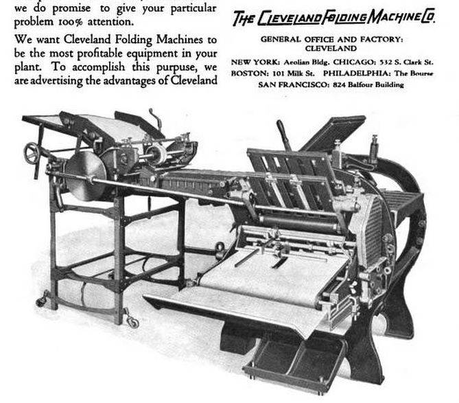 ![]() At left is a 1917 Cleveland Folding Machine Co. folder ad. The above 1926 Cleveland Folding Machine Co. book makes no mention of the N.Y. Dexter Folder Co. This knowledge shoots down a theory I bet you never thought of as to why the Dexter Folder Company called their folders Cleveland. I know the first rational thought is the factory was in Cleveland. Yes, but also Grover Cleveland was a two term President and former Mayor of Buffalo, N.Y. around the time of the beginning of Dexter's Pearl River, N.Y. company. |
