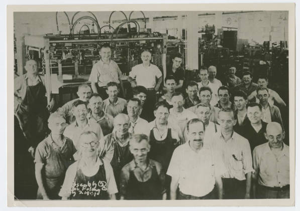 ![]() Early company photo shows the first type of folder, as seen in left illustration. It was a hand fed knife folder. |