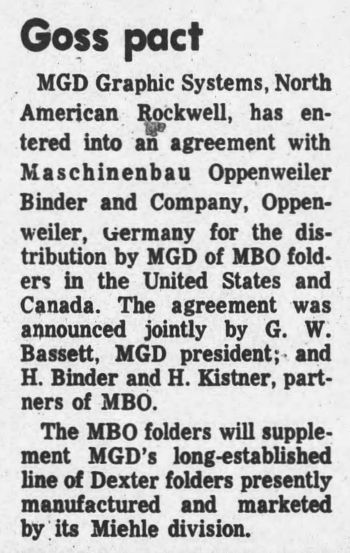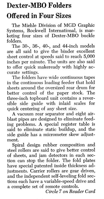 Page 13 The sale of manufacturing facility to Dexter - Lawson Products Ltd., a newly- formed Canadian firm, by Graphic Systems Group (GSG) of Rockwell international of Canada Ltd. has been jointly announced by both firms. The sale includes an 86,000 square-foot fully equipped plant located in Cambridge, Ontario, Canada. It also includes the manufacturing and marketing rights for paper cutters, mill trimmers, paper drilling machines, buckle folders and metal handling machines sold under the trade name Dexter and Lawson. However, Edward Lemanski, GSG's vice president-Miehle Commercial Products said that GSG would retain the marketing and service of Wohlenberg (Cutters) and MBO (Folders) product lines to the graphic arts industry. Page 34 MBO is the way to go, says folder manufacturer Miehle's Pete Trittipo (L) and MBO chief executive officer Heinz Binder inspect new MBO T-74 Buckle Folder at DRUPA show. |