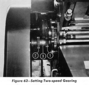 The smaller folders, such as the AS above, had a fast and slow gear which you could slide either to the running gear, depending on the speed you desired. Also the fold down additional rubber tires were helpful for smaller brochures. The folder in this photo doesn't have them.